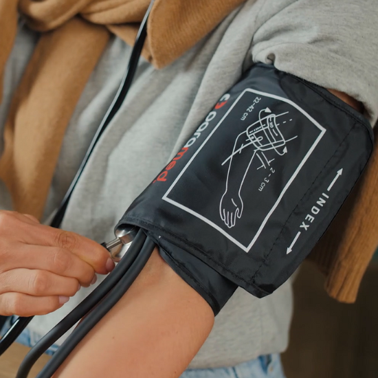 An FDA-approved and latex-free kit with an accurate and convenient manual blood pressure cuff in black. This kit is equipped with a stethoscope.